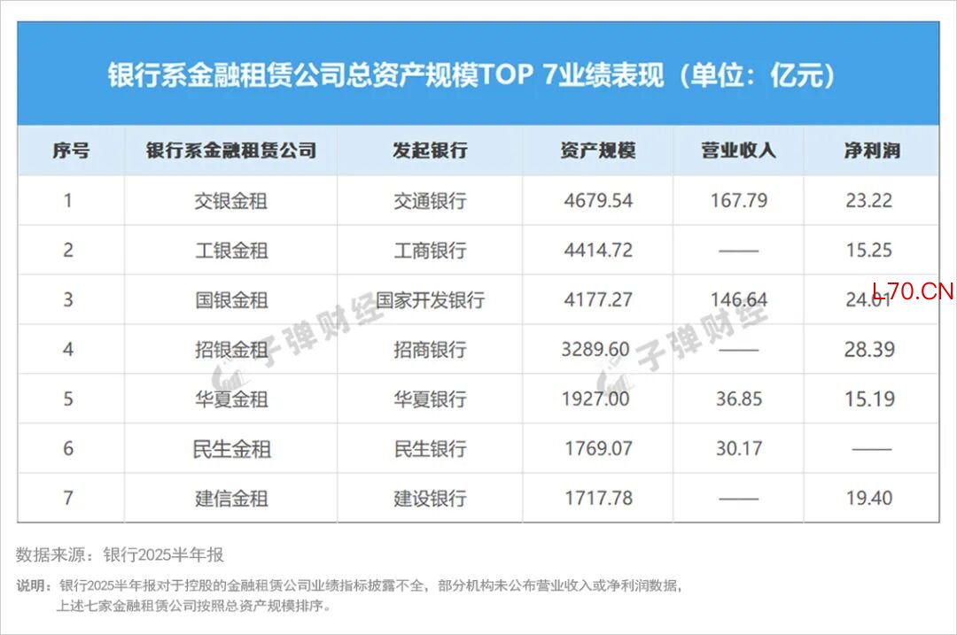 ‘子弹财经’梳理发现,我国首批五家银行系金融租赁公司(工银金融租赁、建信金融租赁、交银金融租赁、招银金融租赁和民生金融租赁)的总资产规模位列行业前七名。