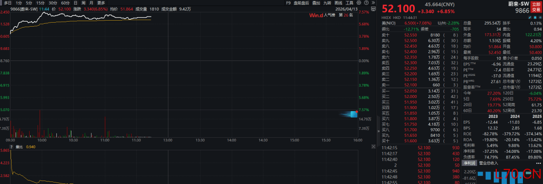 恒生科技指数盘中跌幅亦超过1%。恒生科技指数成份股中,蔚来-SW领涨,盘中涨幅超过7%。