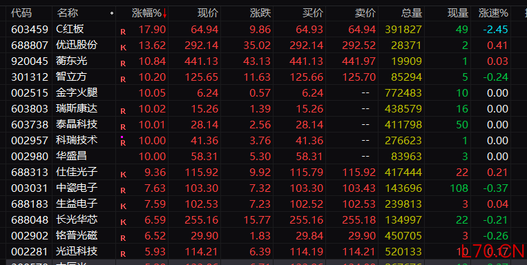 概念板块方面,CPO概念大涨,成为上午市场比较醒目的亮点之一。优迅股份大涨逾13%,蘅东光大涨近11%,仕佳光子大涨逾9%。不过,CPO概念此前的龙头股新易盛(300502)、中际旭创(300308)、天孚通信(300394)不同程度调整。