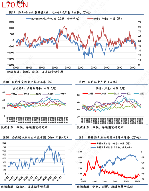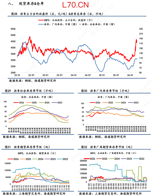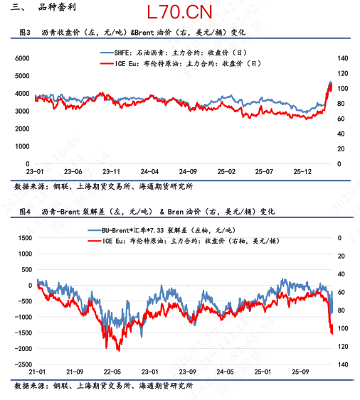 沥青整体维持高位震荡。上周沥青社会库存有所累积,关注其是否突破2025年均值线水平。基本面上依旧维持原料偏紧预期下价格高位支撑,现货炼厂端选择停产/降负等手段使得供应下降明显,产能利用率下滑明显,贸易商心态上惜售为主。主营炼厂间歇停产,地炼企业受限于原料成本高位停产。目前沥青价格普遍处于有价无市状态,下游接收价格能力弱,普遍观望情绪浓厚。价格的推涨更多是地缘的推动作用。但目前来看,美伊战争持续性概率高,冲突或有进一步升级迹象,随着4月份之后铺路刚需一旦启动,届时下游买家将不得不承担高价接盘。