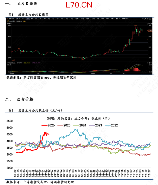 元股证券:ygzq.hk【1】期货盘面:3月31日国内收盘,BU 2606主力合约日内震荡走低。收盘价4512,较上个交易日收盘价环比下跌1.5%。盘中最高触及4630,最低4440。04近月合约环比下跌1.63%。