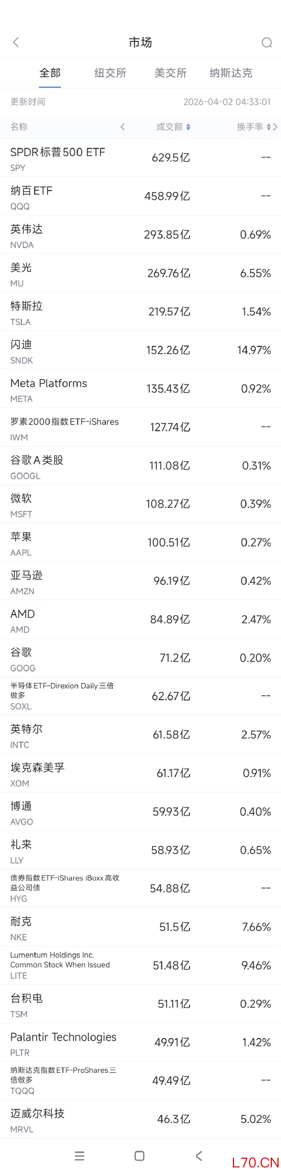第3名特斯拉收高2.56%,成交219.57亿美元。多位消息人士向媒体证实,埃隆·马斯克旗下的SpaceX已向美国证券交易委员会秘密提交了首次公开募股申请。