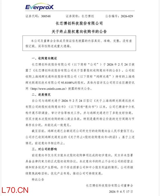 4月17日晚间,光通信领域上市公司长芯博创公告称,公司此前拟收购上海鸿辉光通(以下简称“鸿辉光通”)持有的上海鸿辉光联通讯技术有限公司(以下简称“鸿辉光联通讯”)93.8108%股权。自签署意向书以来,双方虽进行了多轮友好协商,但就本次股权收购的核心商业条款,特别是最终转让价款的支付周期与节奏存在分歧,未能达成一致意见。